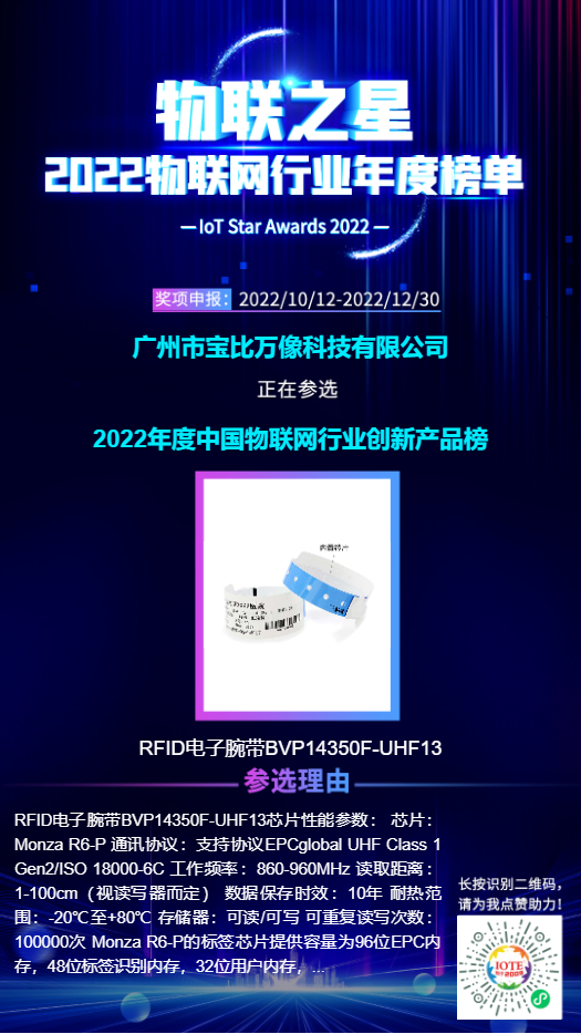 今年,宝比万像自主研发设计生产的RFID电子腕带BVP1435F-UHF13正在参选RFID创新产品榜,2022年12月30日前,每天可进入页面进行投票,希望大家为宝比万像参选产品投票,感谢支持!
