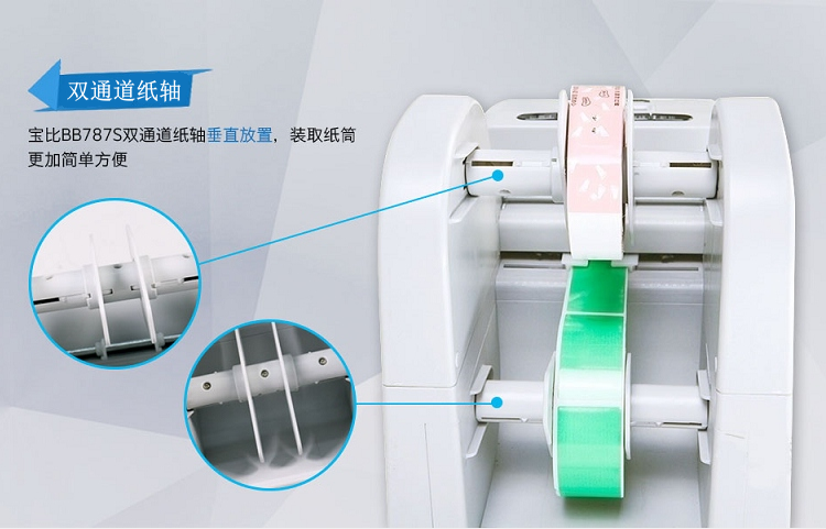 专利设计的双组双通道,可以同时放置两卷标签,并且机身开放式设计,标签卷没有体积限制,所以一次可以放置的标签容量大,不用频繁更换,节约时间。